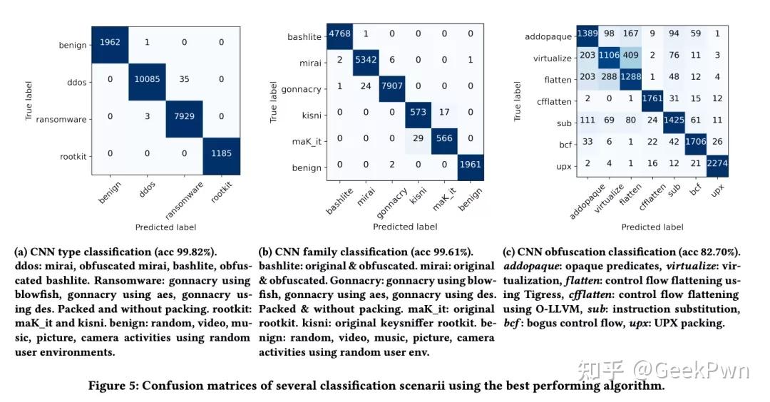 在研討進(jìn)程中,他們對裝置了普通軟件且感染了不同野外惡意軟件樣本的物聯(lián)網(wǎng)設(shè)備停止剖析,記載了超越10萬條測量結(jié)果,*終得出了卻論。運(yùn)用這種方法,惡意軟件研討員能準(zhǔn)確獲知惡意軟件的類型和身份,不需求對目的設(shè)備停止任何修正。這種方法可以獨(dú)立停止部署,無需額外開支,且難以發(fā)現(xiàn)并規(guī)避。更重要的是,運(yùn)用這種方法可以在訓(xùn)練階段對運(yùn)用混雜技術(shù)更改正的惡意軟件樣本停止分類,還能識(shí)別出運(yùn)用了哪種混雜技術(shù)。關(guān)于惡意軟件剖析人員來說,這招確實(shí)很有用。